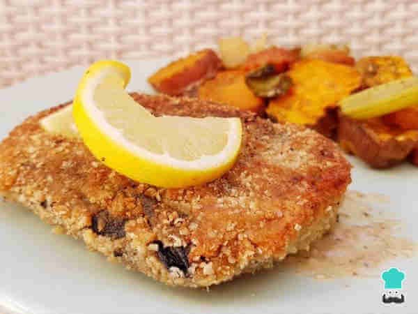 - Dividir el resto de las láminas de alga en trozos y pegar en uno de los lados de la milanesa cada trozo, como si fuera la piel del pescado.
